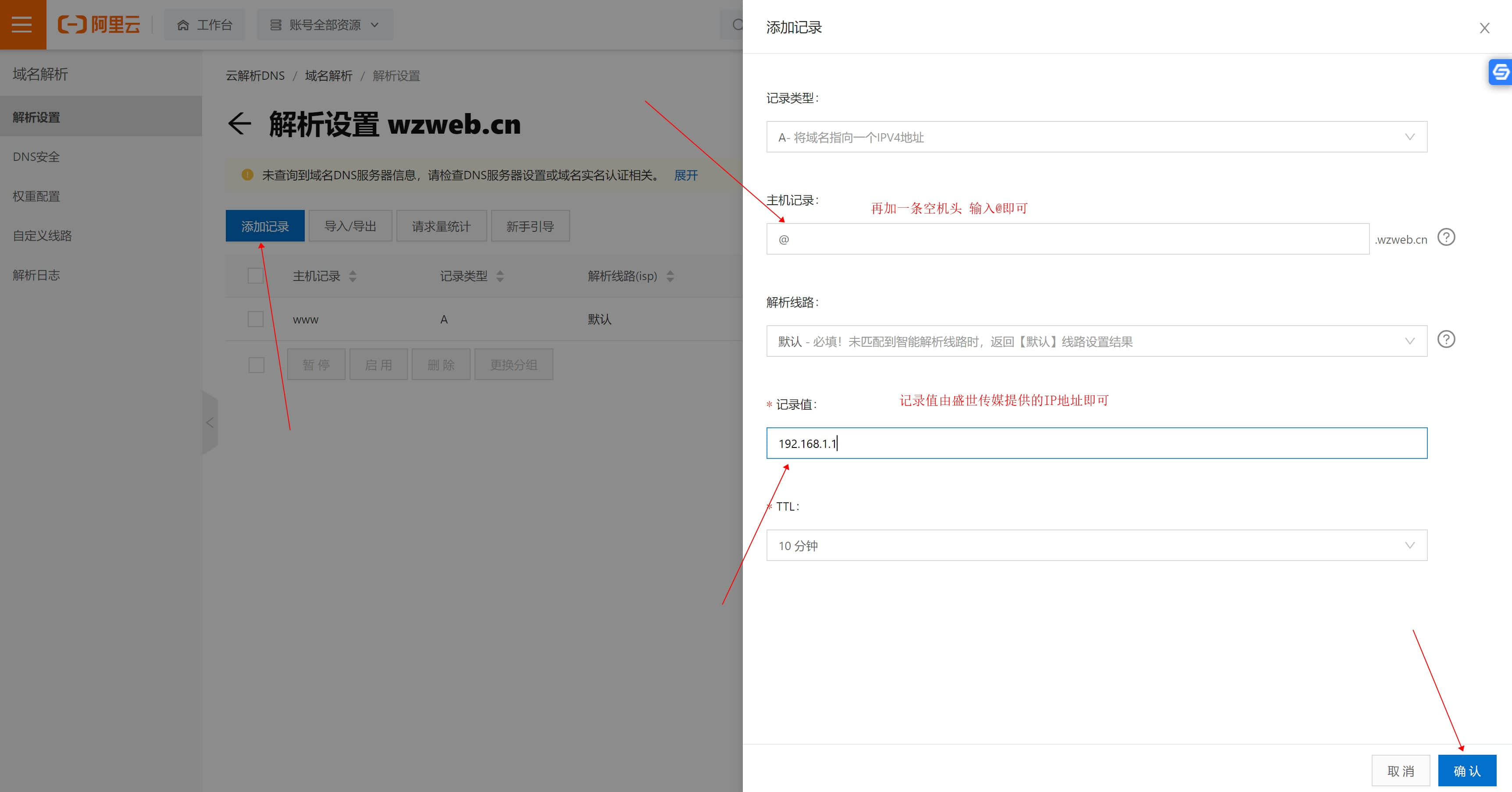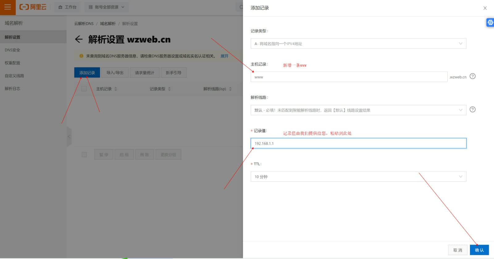 2.輸入主機(jī)記錄www ,記錄值由我們提供給您的,粘貼到記錄值此處,確認(rèn)即可。