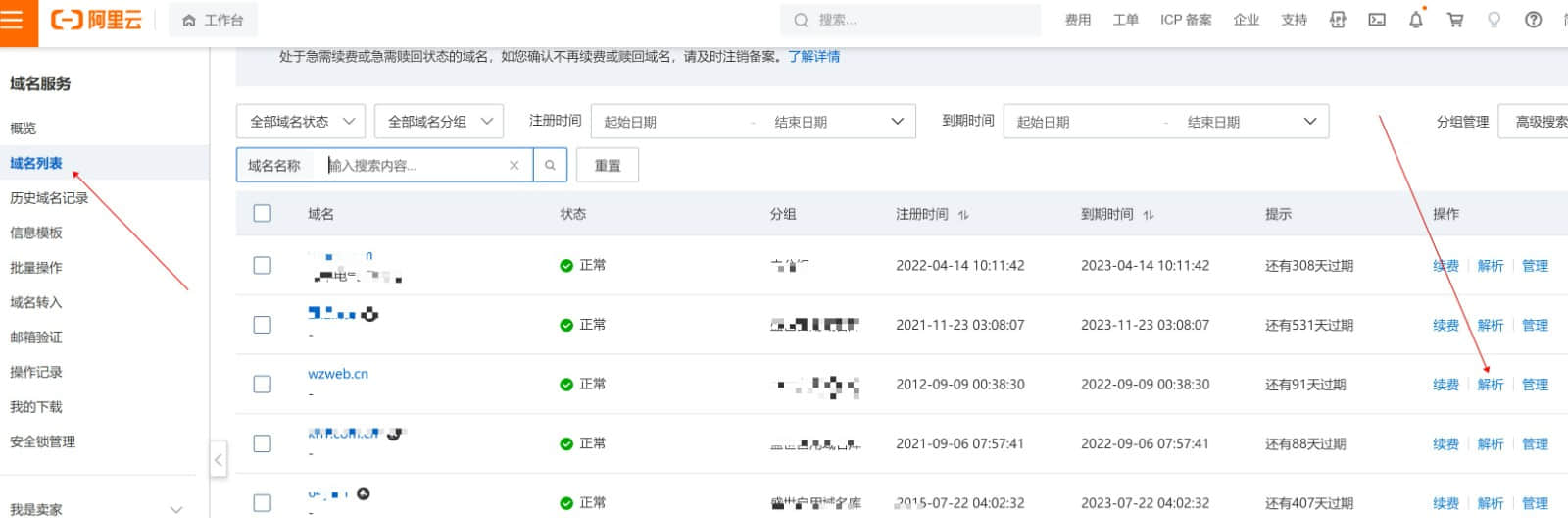 1.在阿里云域名列表找到自己要解析的域名,點(diǎn)擊右側(cè)對(duì)應(yīng)的解析