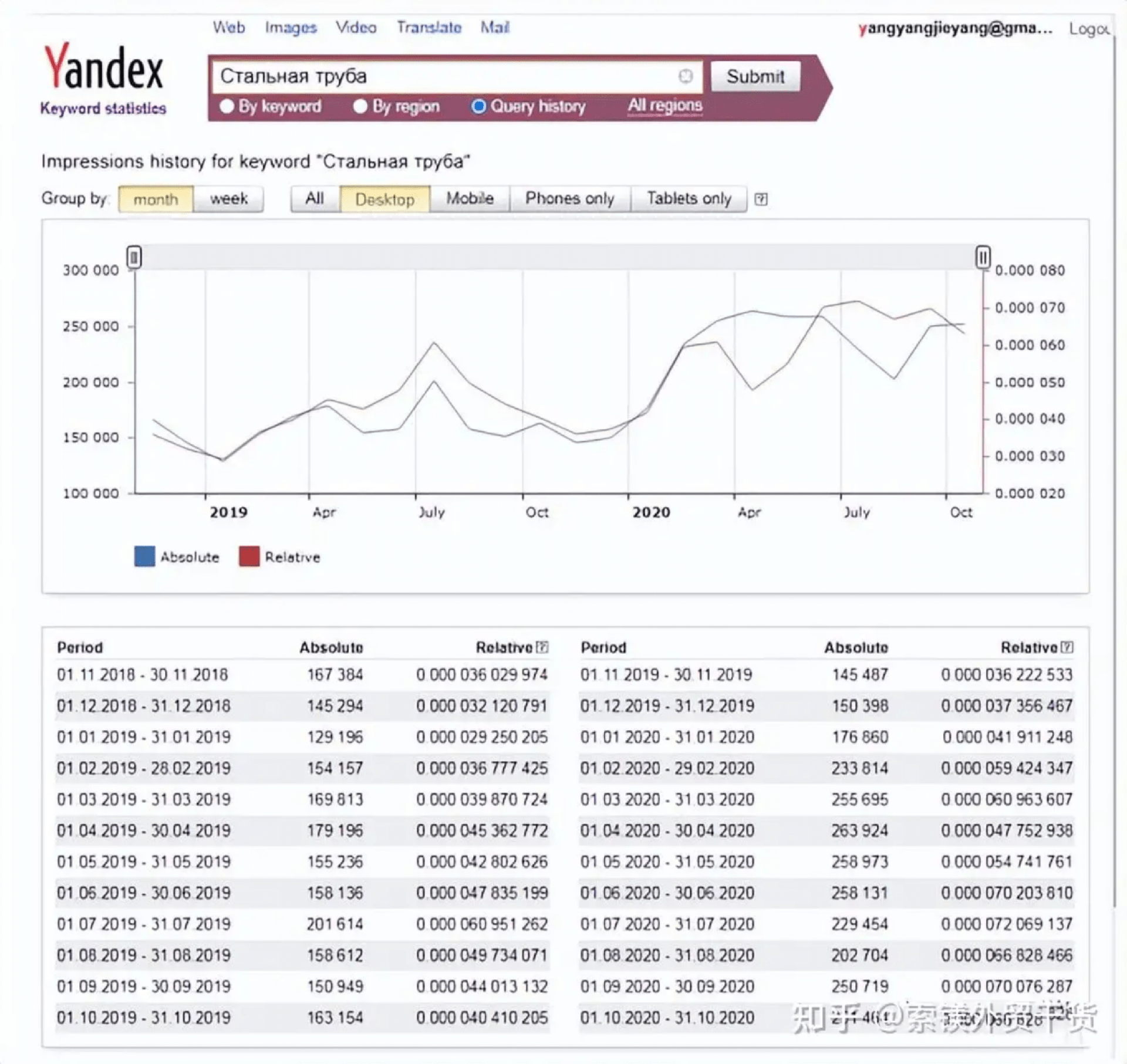 這里的藍(lán)線(absolute)代表絕對指標(biāo),指的是關(guān)鍵詞的展示量;紅線(relative)是相對指標(biāo),指的是關(guān)鍵詞展示量在整個頁面詞展示量之比,表示搜索關(guān)鍵詞的歡迎程度。當(dāng)紅線高于藍(lán)線時,需求高于正常值,反之,則低于正常值。