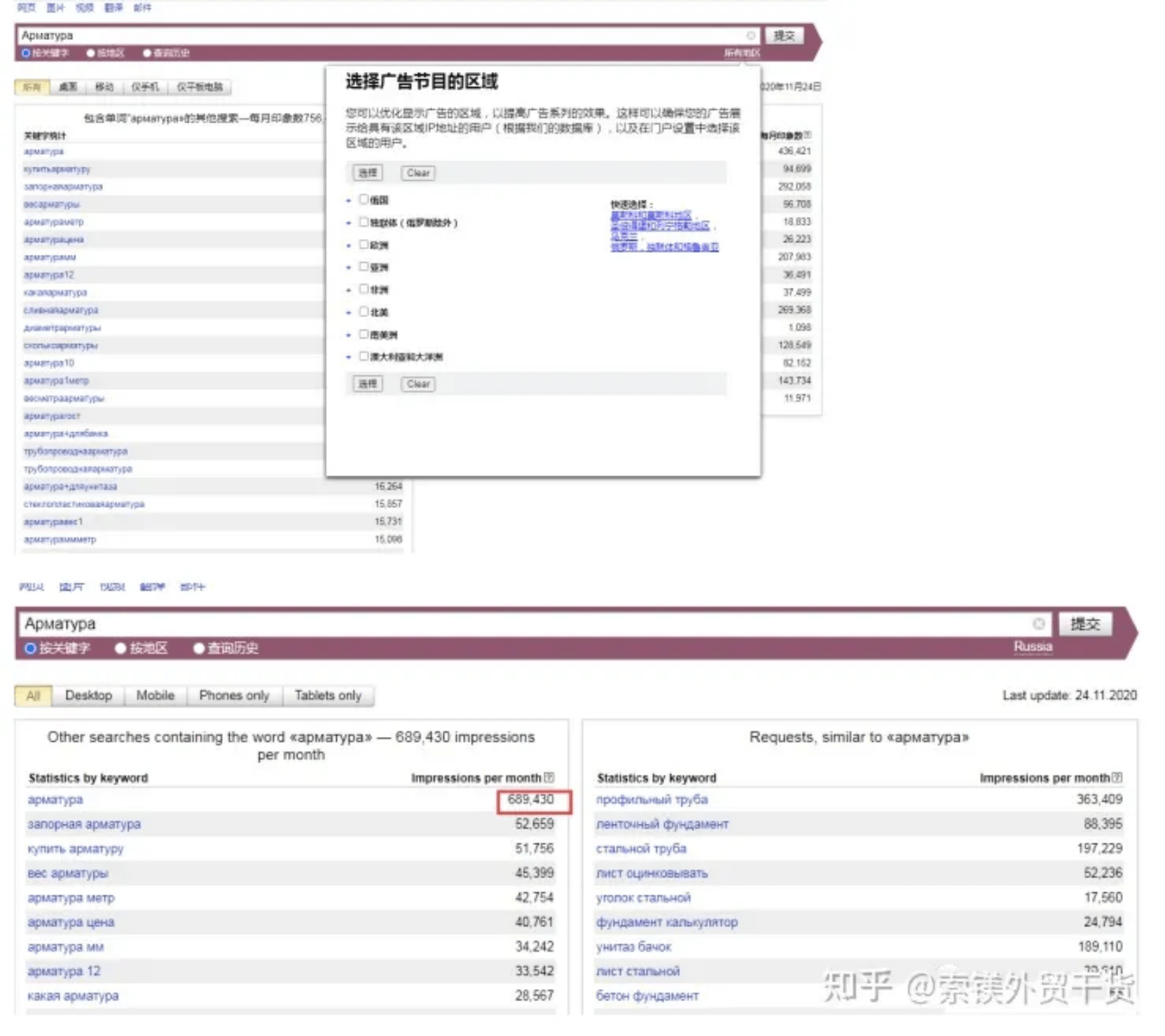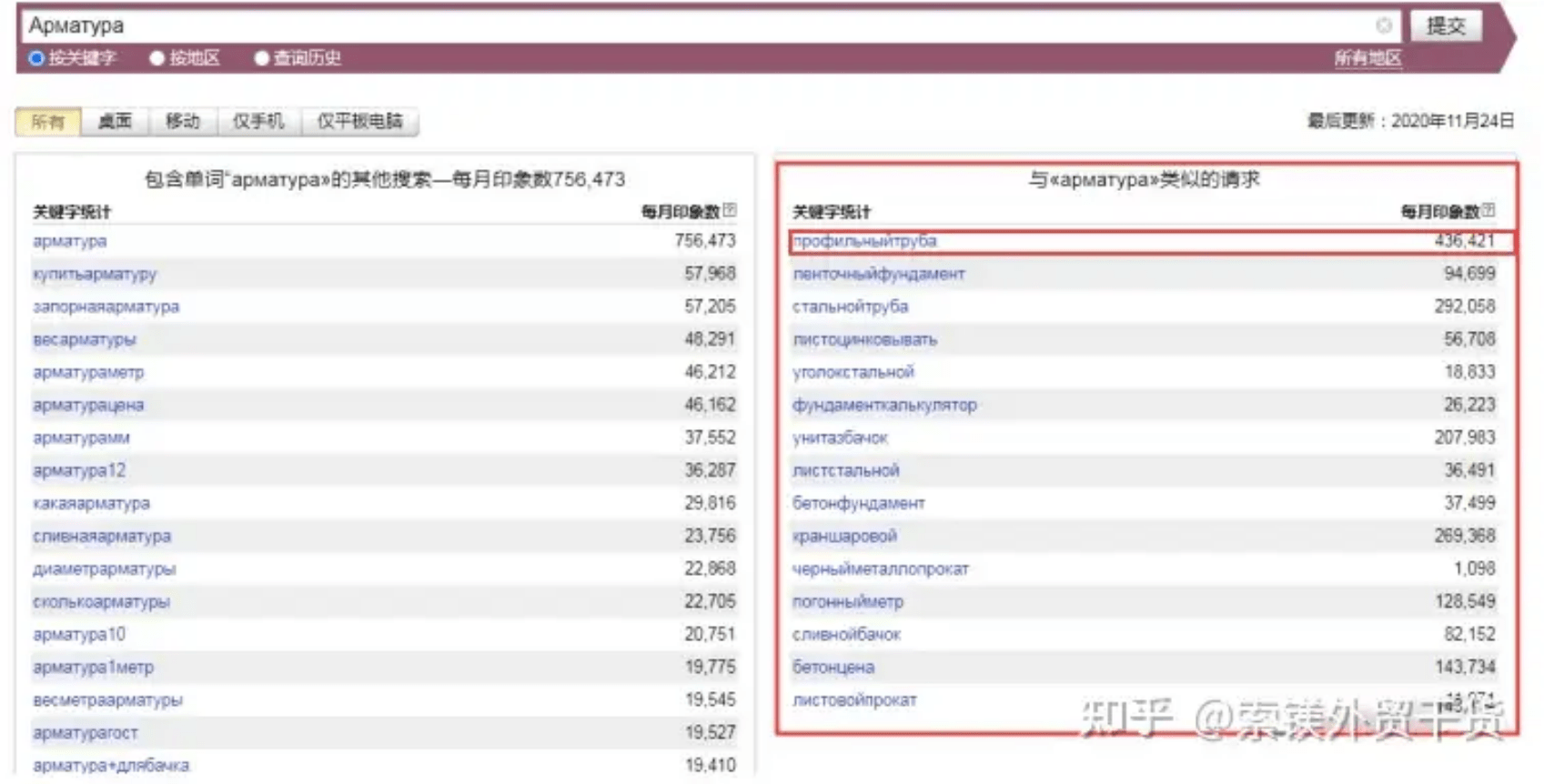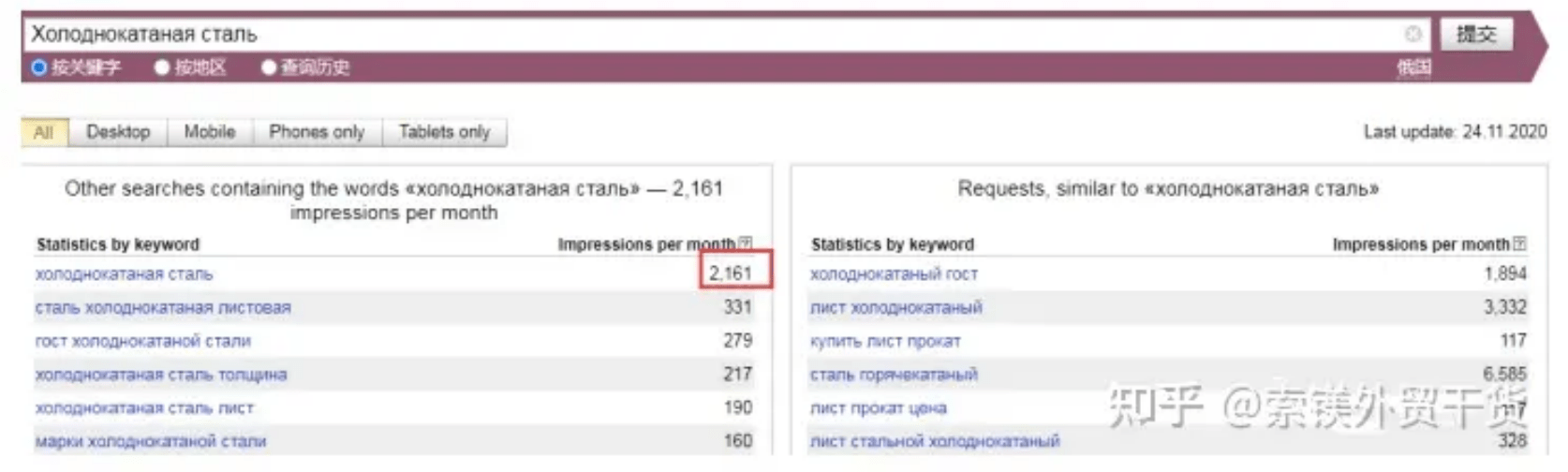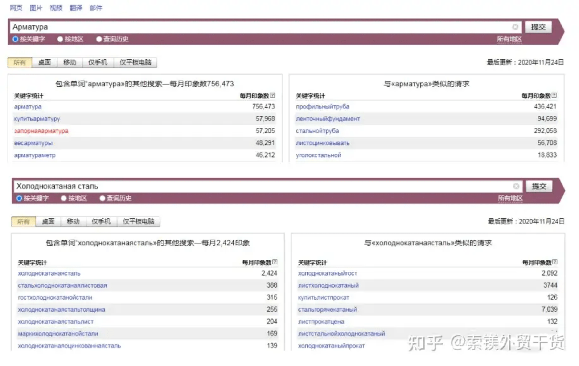 分別輸入鋼管企業(yè)常見的出口產(chǎn)品,這里我們選擇Арматура(螺紋鋼)和Холоднокатаная сталь(冷軋鋼),可以看到螺紋鋼的搜索量為756473,遠(yuǎn)高于冷軋鋼。
