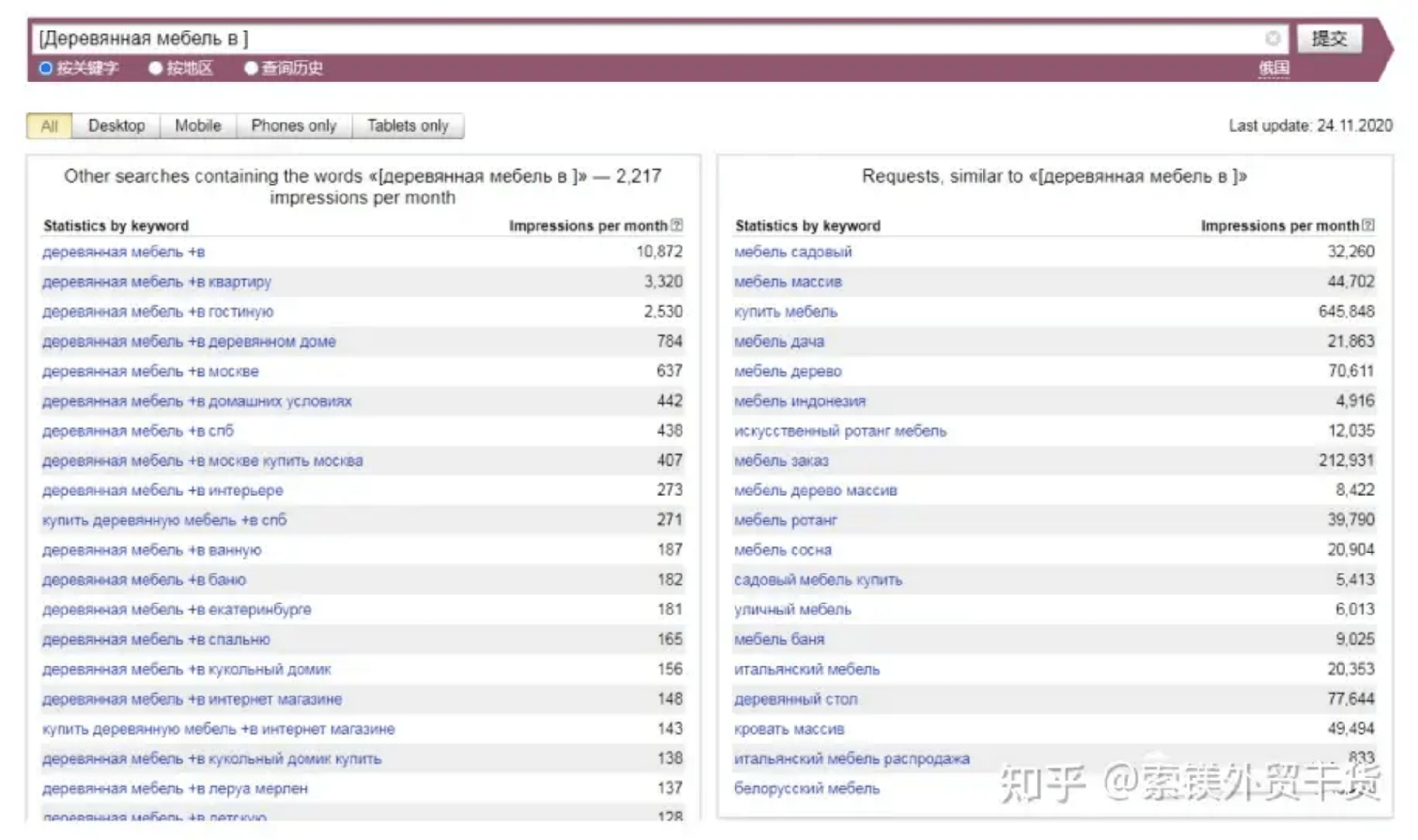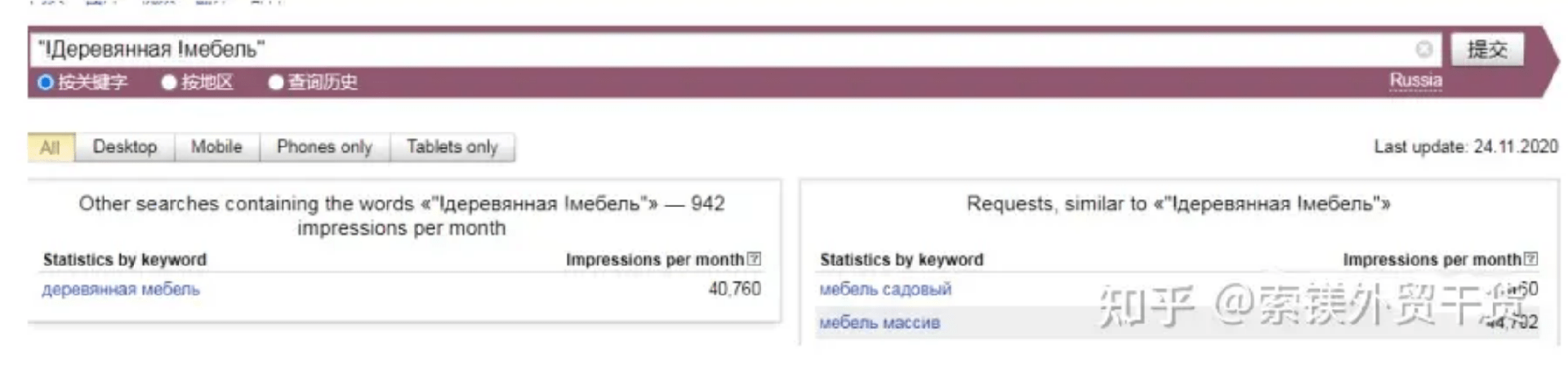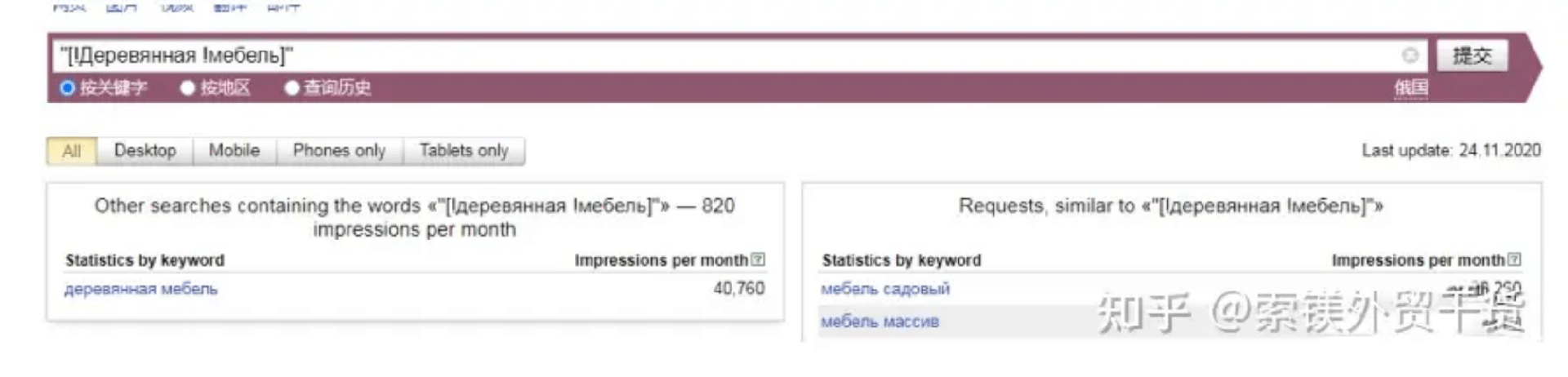 允許排除其他單詞,固定單詞形式及查詢順序。如圖,搜索“[!木質(zhì)!家具]”得出只含木質(zhì)、家具兩詞,且順序相同的關(guān)鍵詞搜索量,為820。