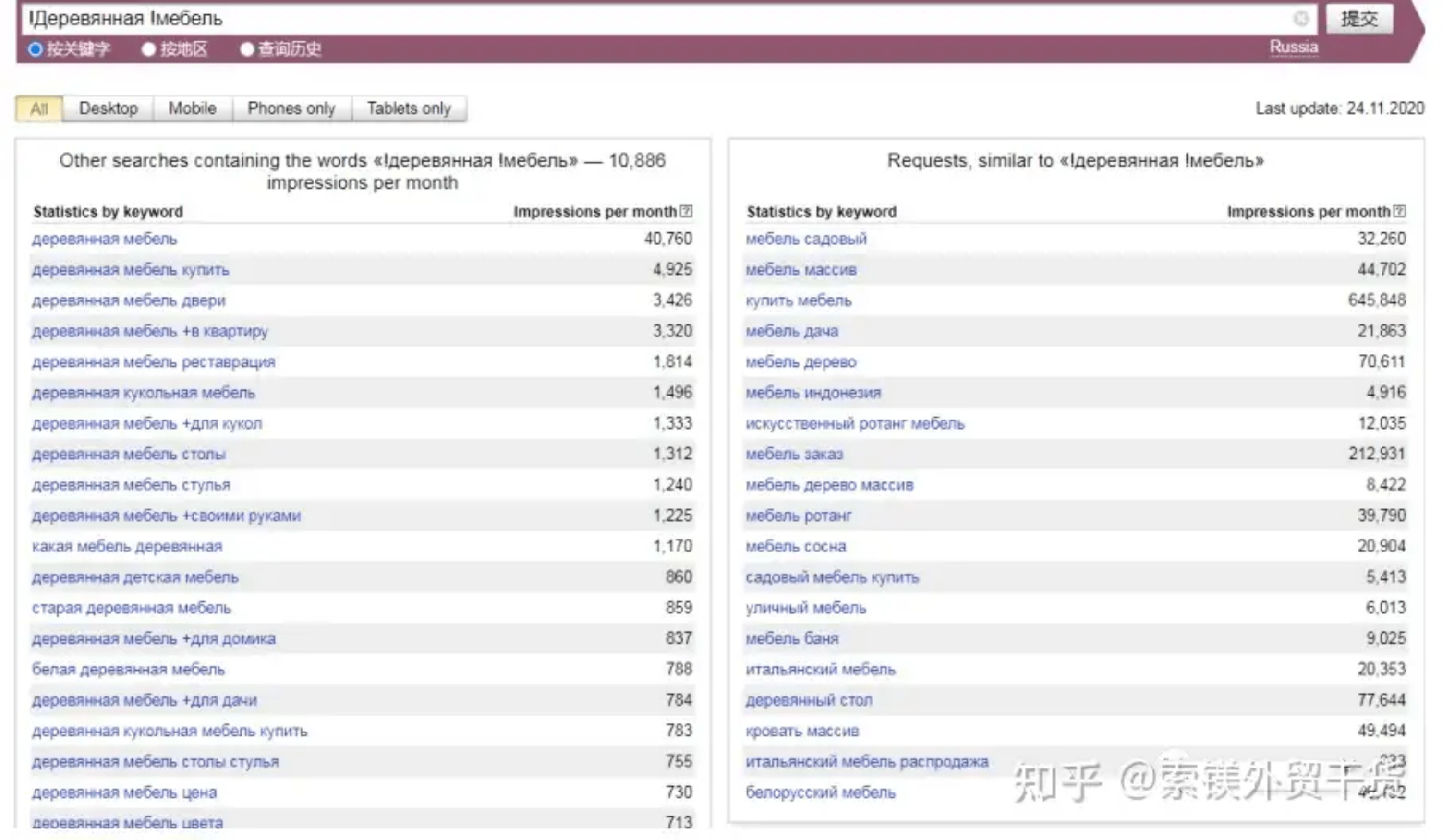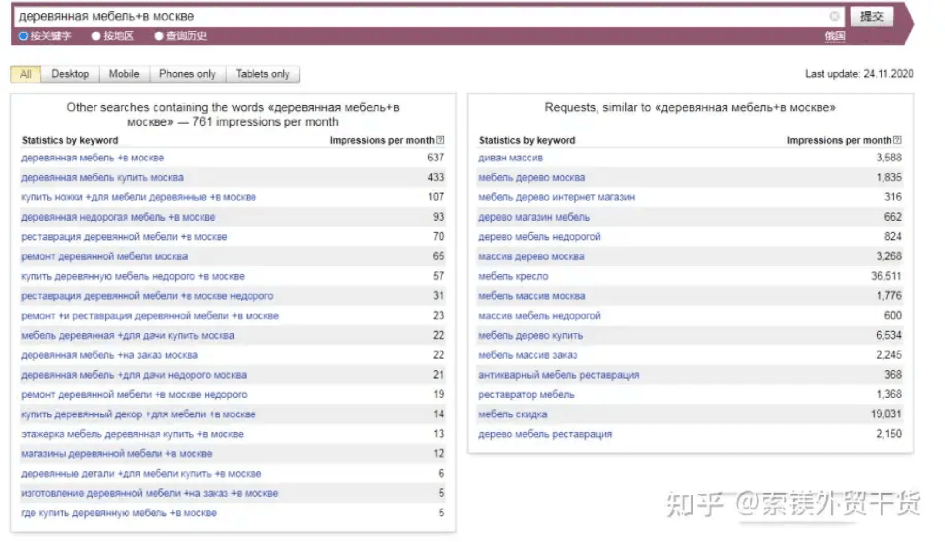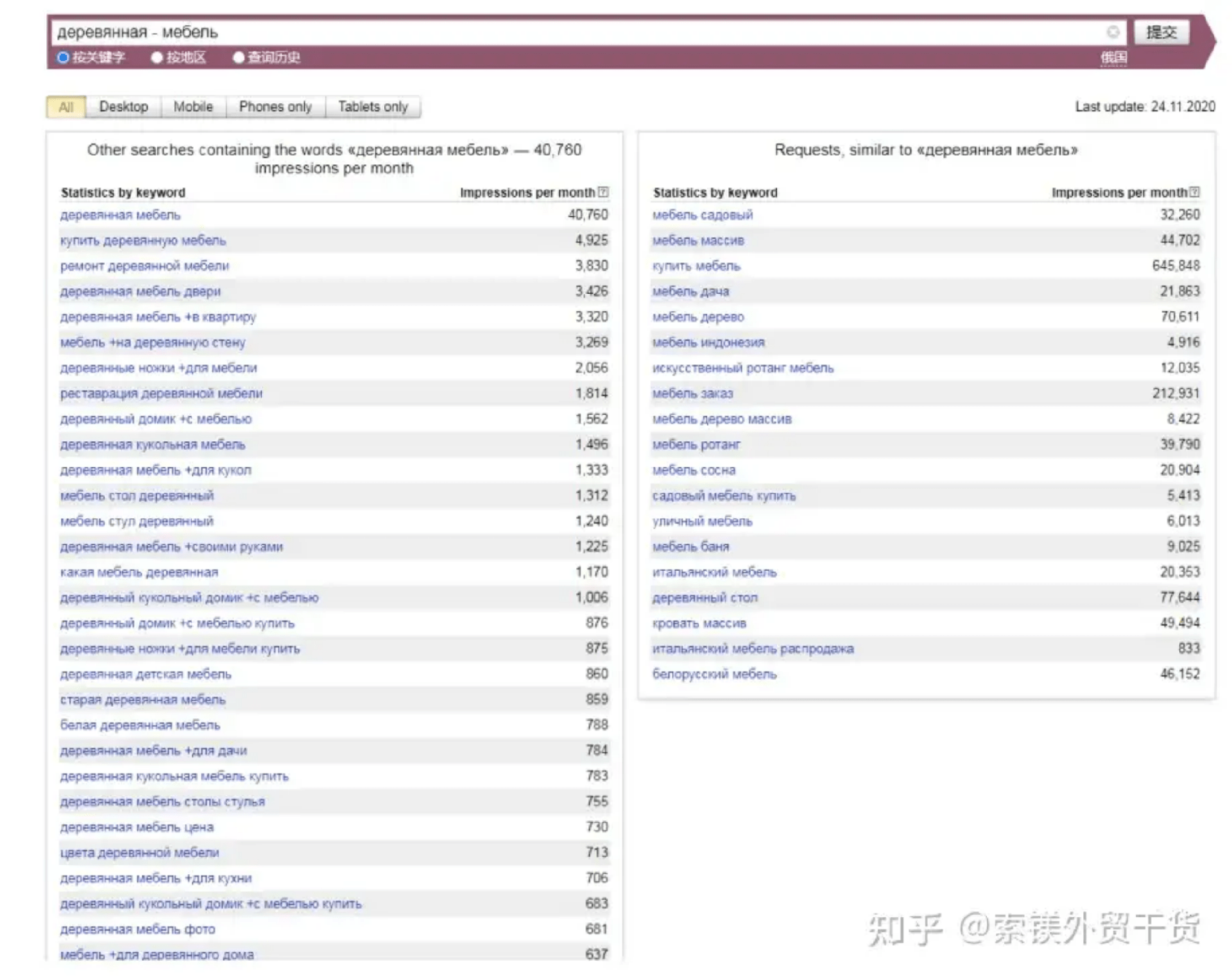 允許排除其他單詞,固定單詞形式及查詢順序。如圖,搜索“[!木質(zhì)!家具]”得出只含木質(zhì)、家具兩詞,且順序相同的關(guān)鍵詞搜索量,為820。