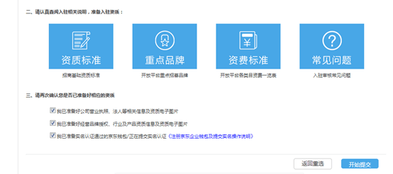 5、查看京東平臺入駐相關(guān)資質(zhì)要求,確認(rèn)后點擊開始提交